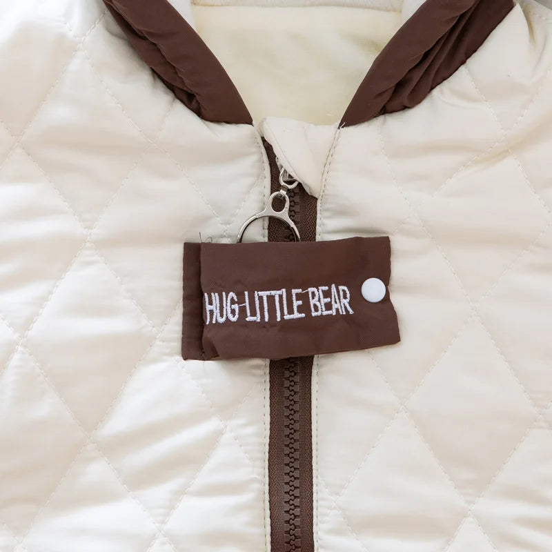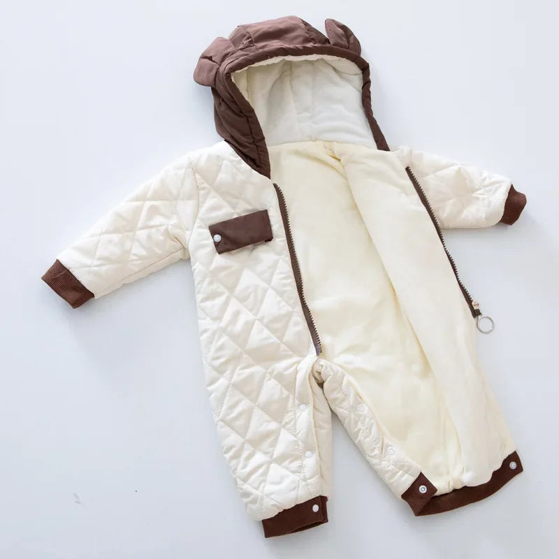 Cozy and soft, this fleece baby romper keeps your little one warm with its snug hood, easy zip closure, and cuffed sleeves. Made from gentle and breathable materials.